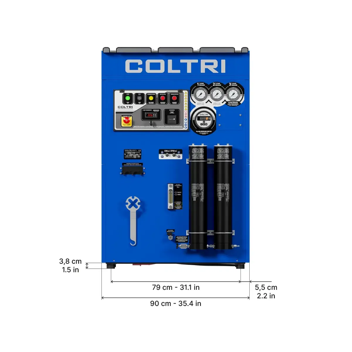 Placed after the last compressor separator and before the pressure maintenance valve, the purification system Hyperfilter enables reliable treatment of the breathing air, according to DIN EN 12021¹ when using original filter cartridges. The separator present between the 2nd and 3rd stages of the purification circuit makes it possible to extract as much moisture as possible. The filtering capacity with inlet air at 20°C and 200 bar is 3,050 m³.