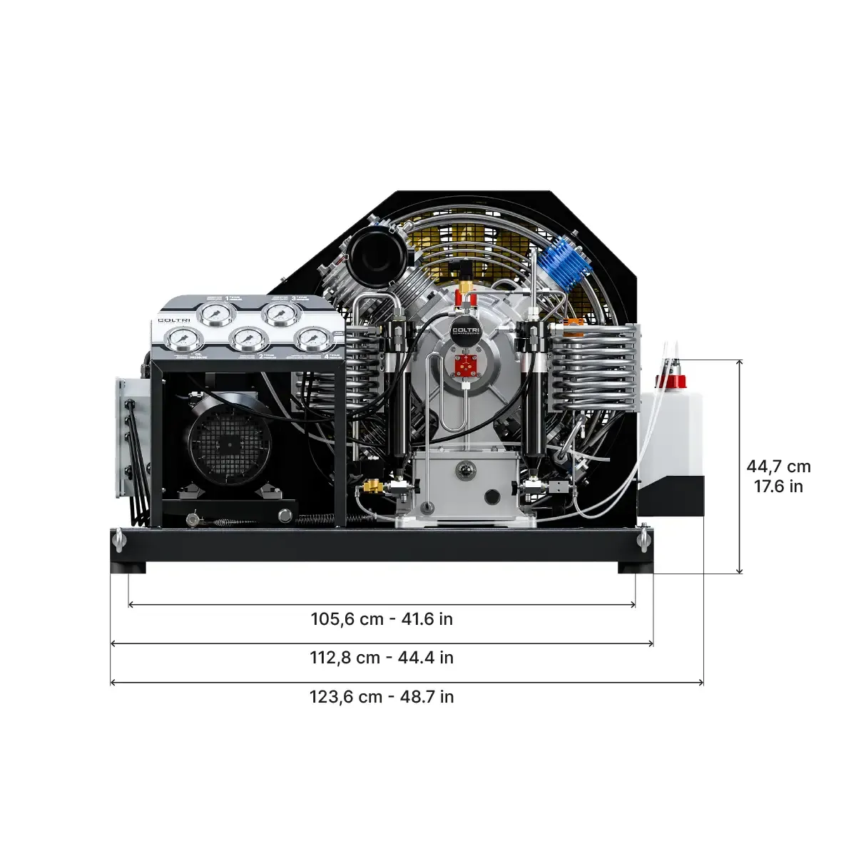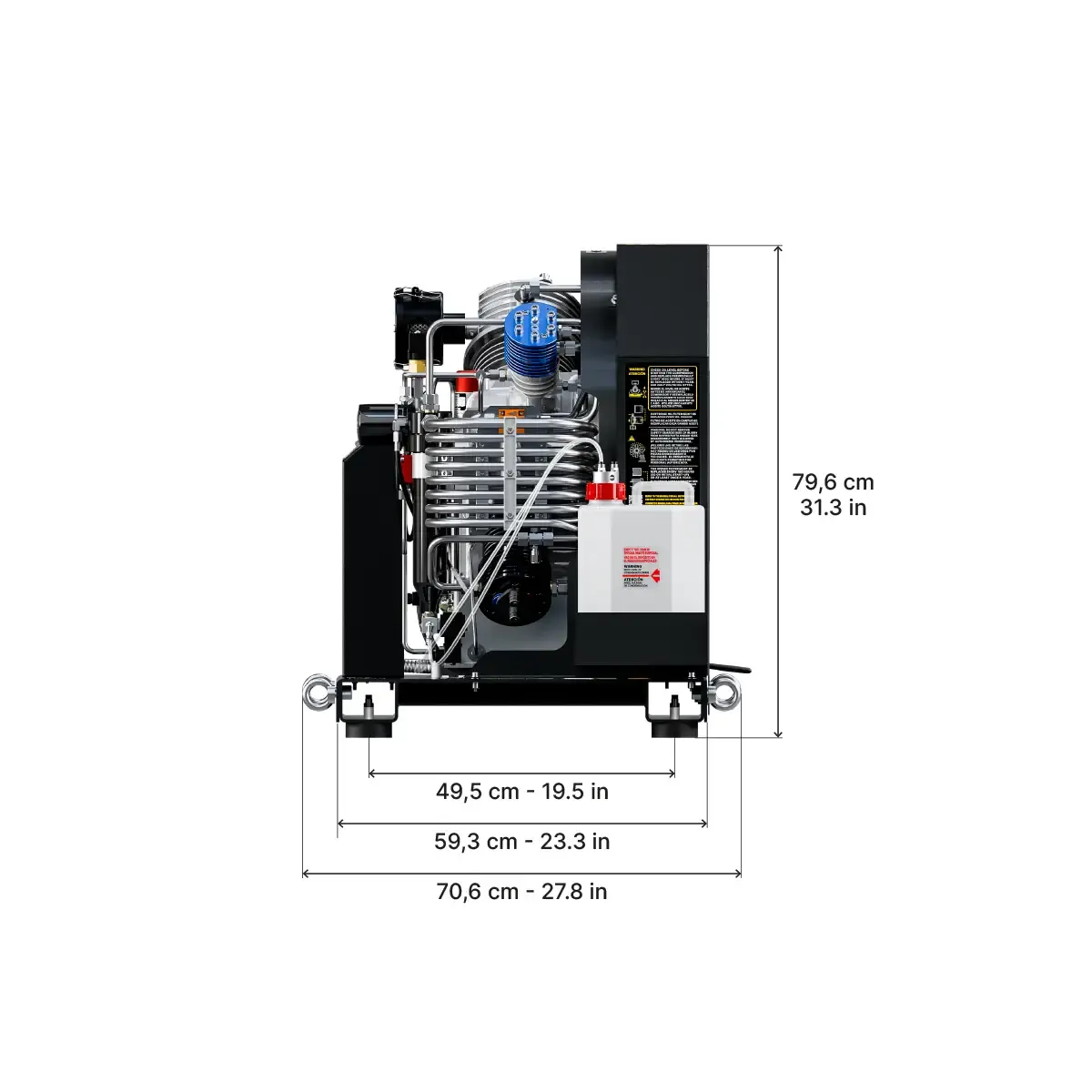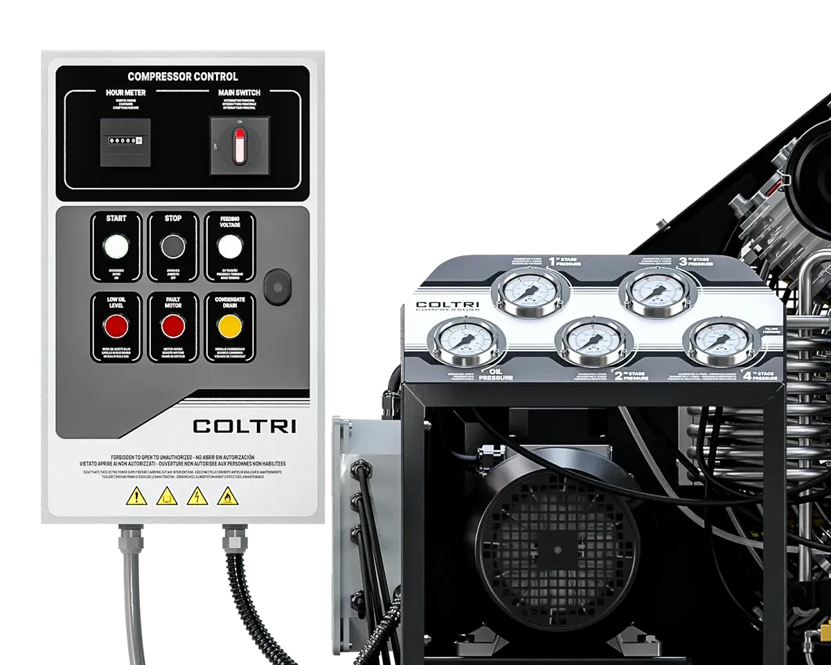 4 Cylinder connections from your choice of DIN 232, DIN 300 or INT/YOKE 232 bar4 whips of 1.2 m in lengthPressure holding valveInterstage control manometersDouble filter system Hyperfilter PED certifiedPurification system on “stand-alone” structureAutomatic condensate drainOil level control with automatic shutdownOil pumpFrame color Black RAL 9005