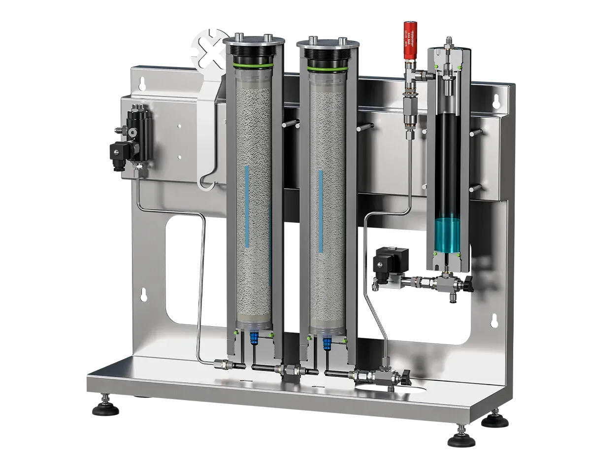 It is equipped with the Hyperfilter stand-alone mounted purification system with automatic condensate drainage. For longer filter life, the Tornado high-pressure dryer is recommended. Available as optional extras: the Presec system for filter saturation control, Megafilter oversized filter cartridges, and 2- or 4-outlet remote refill panel.