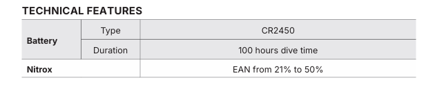 - User-replaceable battery (CR 2450) with a long battery life of 100 dives