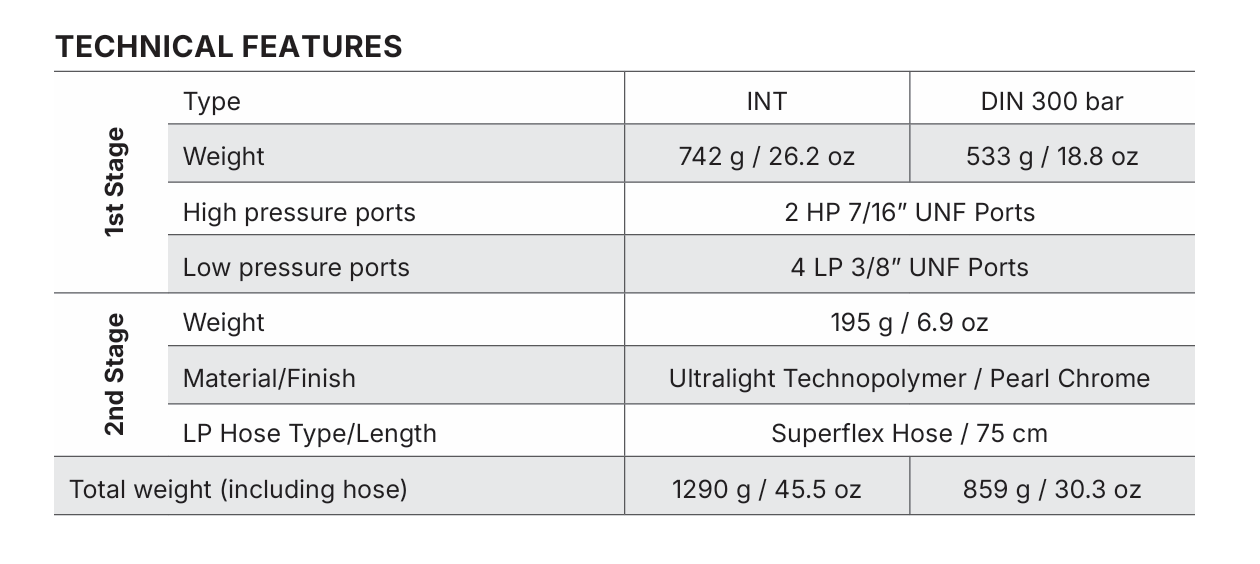 The Dual Adj second stage is pneumatically balanced with a PAD (Pneumatic Assisted Design) system, offering comfortable and effortless breathing in every situation.