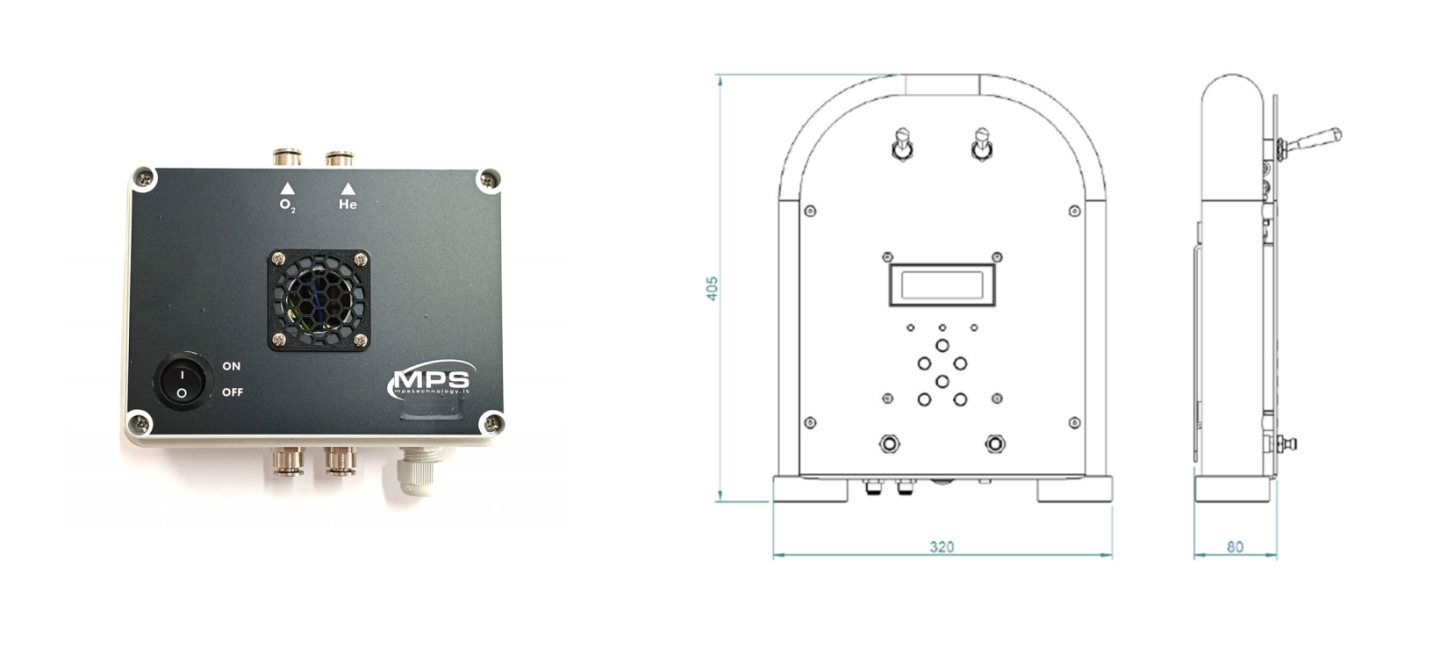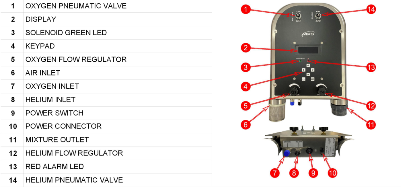 The mixer is supplied with a solenoid box that must be connected to the compressor. Before reaching the mixer, the oxygen and helium tubes must pass through this box.