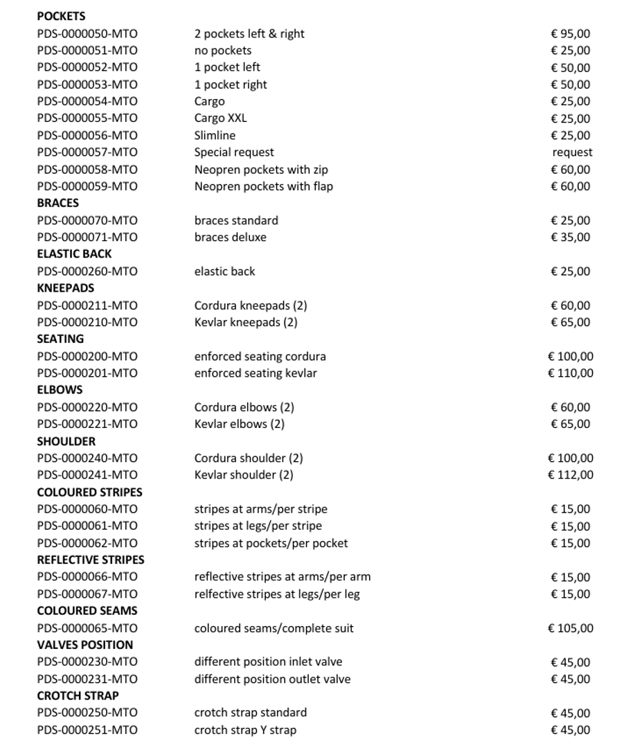 - Izrada MTO suhih odijela s posebim opcijama može se dodatno naplatiti. Pogledajte listu opcija i cjenik. Ispunite Obrazac za Opcije Suhog Odijela i pošaljite nam ga.
